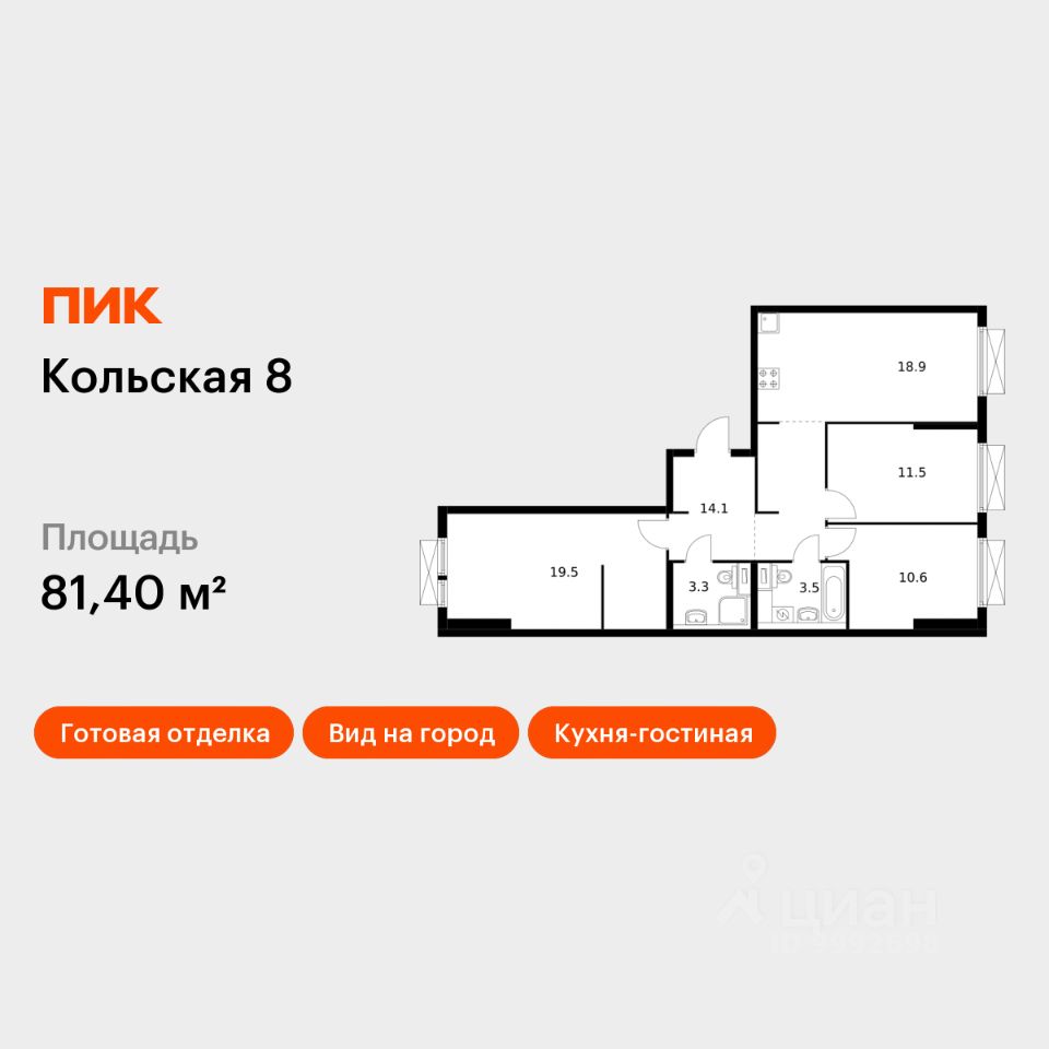 Продаётся 3-комн. квартира площадью 81,4 кв.м на 14 этаже 24 этажного дома (Корпус 2.2, Секция 5) проекта ПИК Кольская 8. Светлый просторный подъезд на уровне земли, функциональная планировка, большие окна, c отделкой.