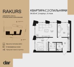 Продаётся 2-комнатная квартира 54.00 м² в жилом комплексе Ракурс. Квартиру отличают панорамное остекление, потолки 2,9 м, улучшенная шумо и воздухоизоляция. Дом сдаётся в 1 квартале 2028 года, продажи проходят через эскроусчета. Подземный паркинг, коворкинг, закрытая благоустроенная территория с фонтаном и артобъектами. Гибкие условия покупки. Rakurs — место, в котором жизнь приглашает к исследованию. Концепция проекта knowledge-centric среда, которая выражается здесь в образе жизни: • атмосфере интеллектуальной среды, • доступности образования, • фокусе на возможности для развития. RAKURS разместился в районе науки и окружен исследовательскими институтами и образовательными учреждениями, при этом на территории построена своя школа с уникальной концепцией. Расположенный на пересечении улиц Маршала Бирюзова и Берзарина, недалеко от станций метро "Октябрьское поле" и "Зорге", дом угождает транспортной доступностью автомобилистам и пешеходам. Инфраструктура же района создана с заботой о людях: здесь много парков, кафе и других уютных мест для отдыха. В состав комплекса входят три башни высотой 18, 26 и 44 этажа, каждая из которых имеет свой запоминающийся силуэт. Между собой башни связаны среднеэтажными строениями с индивидуальными фасадами. Композиция и пластика корпусов, а также панорамное остекление башен обеспечивают квартиры максимальным количеством дневного света и выигрышными видами на центр города и Москву-Сити. Упор на функциональность не лишает проект его уникального образа — все башни имеют неординарную форму с харизматичными уступами и консолями. Rakurs предлагает широкий выбор уникальных вариантов жилья — от студий до эксклюзивных квартир с приватными террасами. Проект спроектирован с фокусом на биофильность и функциональность. Во дворах Rakurs можно насладиться завтраком на террасе кафе, игрой с детьми или спортом на свежем воздухе. В Rakurse cвой комьюнити-центр - многофункциональное пространство для работы, отдыха, общения и развития. Одна из важнейших частей центра — частная библиотека с лаундж-зоной. Книжный фонд отбирается для нее кураторской командой, а дизайн пространства сделан так, чтобы жители могли почувствовать умиротворяющую атмосферу библиотечного зала. Идея knowledge-centric среды поддерживается здесь и книжным магазином с лекторием, а также зонами для самостоятельной учебы и занятий с преподавателями.