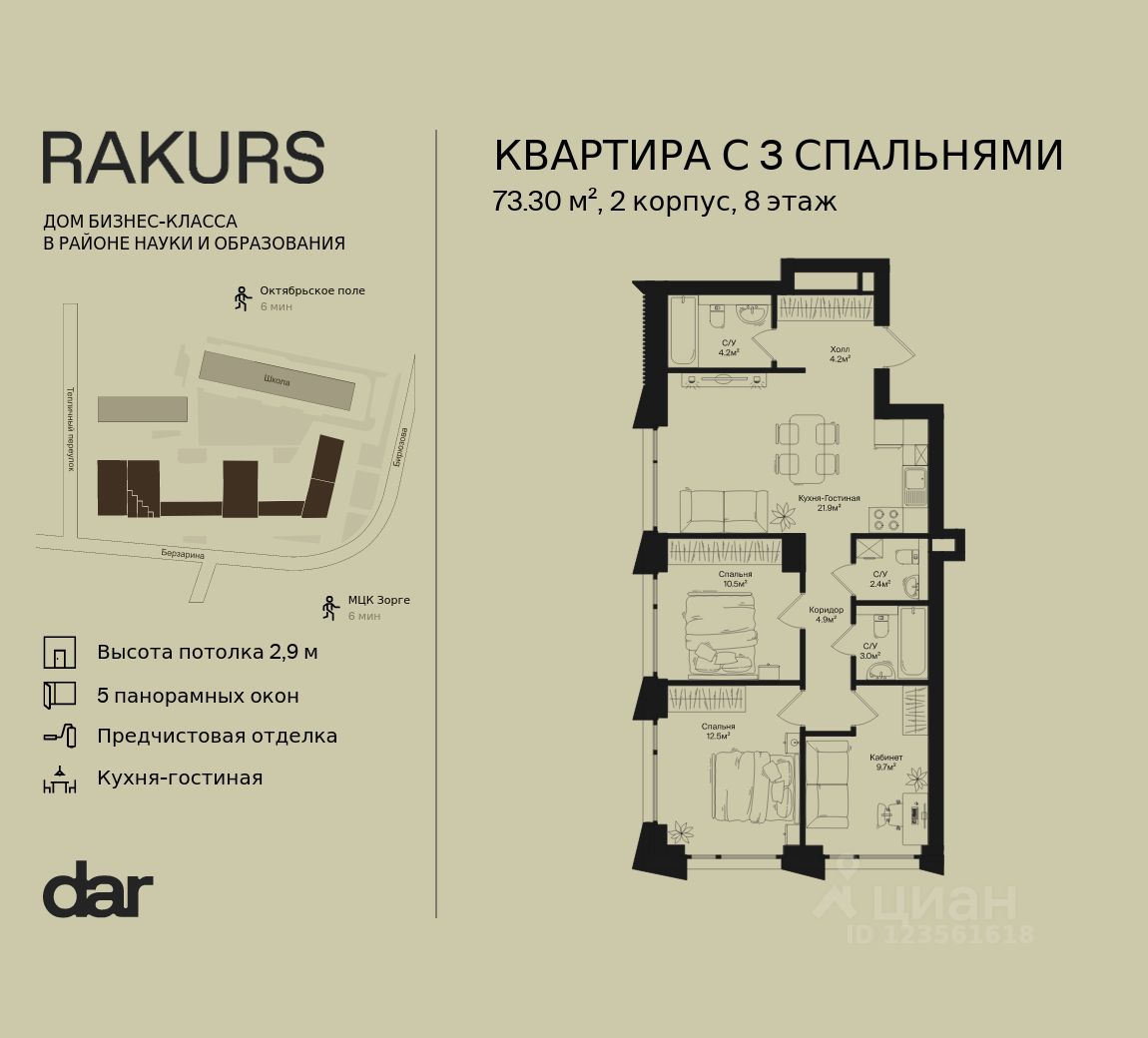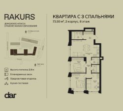 Продаётся 3-комнатная квартира 73.30 м² в жилом комплексе Ракурс. Квартиру отличают панорамное остекление, потолки 2,9 м, улучшенная шумо и воздухоизоляция. Дом сдаётся в 1 квартале 2028 года, продажи проходят через эскроусчета. Подземный паркинг, коворкинг, закрытая благоустроенная территория с фонтаном и артобъектами. Гибкие условия покупки.
