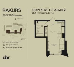 Продаётся 1-комнатная квартира 28.70 м² в жилом комплексе Ракурс. Квартиру отличают панорамное остекление, потолки 2,9 м, улучшенная шумо и воздухоизоляция. Дом сдаётся в 1 квартале 2028 года, продажи проходят через эскроусчета. Подземный паркинг, коворкинг, закрытая благоустроенная территория с фонтаном и артобъектами. Гибкие условия покупки.