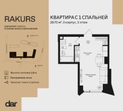 Продаётся 1-комнатная квартира 28.70 м² в жилом комплексе Ракурс. Квартиру отличают панорамное остекление, улучшенная шумо и воздухоизоляция. Дом сдаётся в 1 квартале 2028 года, продажи проходят через эскроусчета. Подземный паркинг, коворкинг, закрытая благоустроенная территория с фонтаном и артобъектами. Гибкие условия покупки.