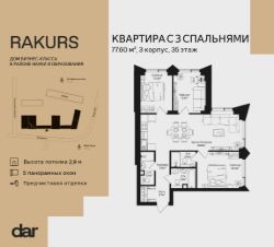 Продаётся 3-комнатная квартира 77.60 м² в жилом комплексе Ракурс. Квартиру отличают панорамное остекление, улучшенная шумо и воздухоизоляция. Дом сдаётся в 1 квартале 2028 года, продажи проходят через эскроусчета. Подземный паркинг, коворкинг, закрытая благоустроенная территория с фонтаном и артобъектами. Гибкие условия покупки.