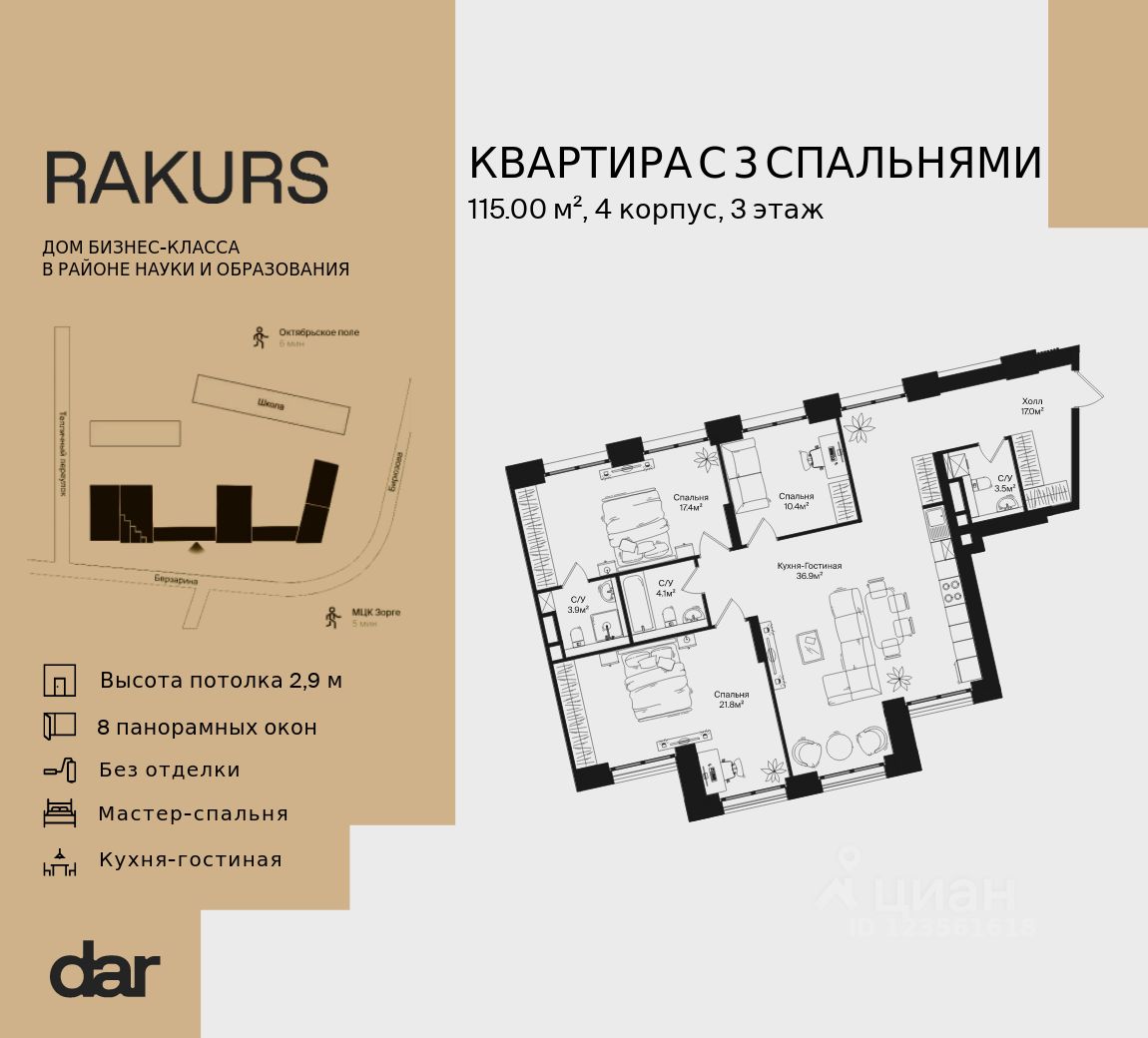 Продаётся 3-комнатная квартира 115.00 м² в жилом комплексе Ракурс. Квартиру отличают панорамное остекление, потолки 2,9 м, улучшенная шумо и воздухоизоляция. Дом сдаётся в 1 квартале 2028 года, продажи проходят через эскроусчета. Подземный паркинг, коворкинг, закрытая благоустроенная территория с фонтаном и артобъектами. Гибкие условия покупки.