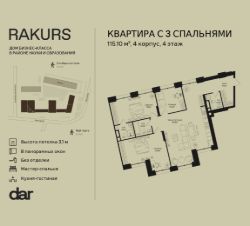 Продаётся 3-комнатная квартира 115.10 м² в жилом комплексе Ракурс. Квартиру отличают панорамное остекление, потолки 3,1 м, улучшенная шумо и воздухоизоляция. Дом сдаётся в 1 квартале 2028 года, продажи проходят через эскроусчета. Подземный паркинг, коворкинг, закрытая благоустроенная территория с фонтаном и артобъектами. Гибкие условия покупки.
