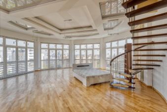 Отделка выполнена в классическом стиле, в светлых тонах. Простор и свет дополняются высотой потолков в 3 метра и окнами в пол.