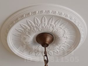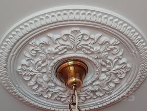 Стены и потолки крашеные. По верху стен идут гипсовые карнизы, под люстрами гипсовыерозетки.