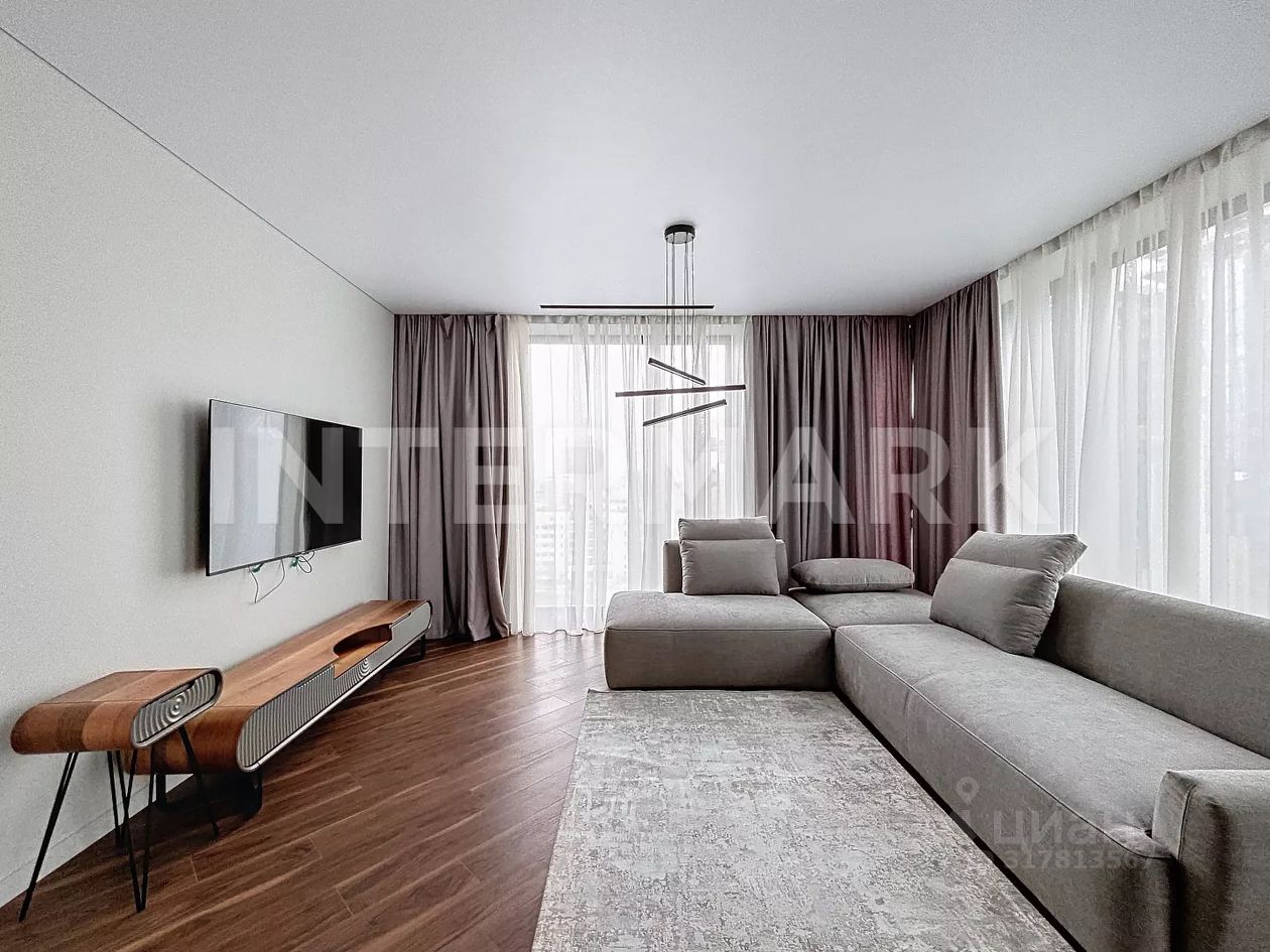 ID 45775. Превосходные 3-комнатные апартаменты в премиальном ЖК SLAVA. Высочайший уровень безопасности и сервиса. Элегантный авторский дизайн, приточно-вытяжная вентиляция, система "умный дом". Апартаменты полностью меблированы и оснащены высококачественной техникой и оборудованием. Общая площадь: 77 кв. м. Планировка: холл, студия гостиная-кухня, две спальни, две ванные комнаты. Панорамные окна.