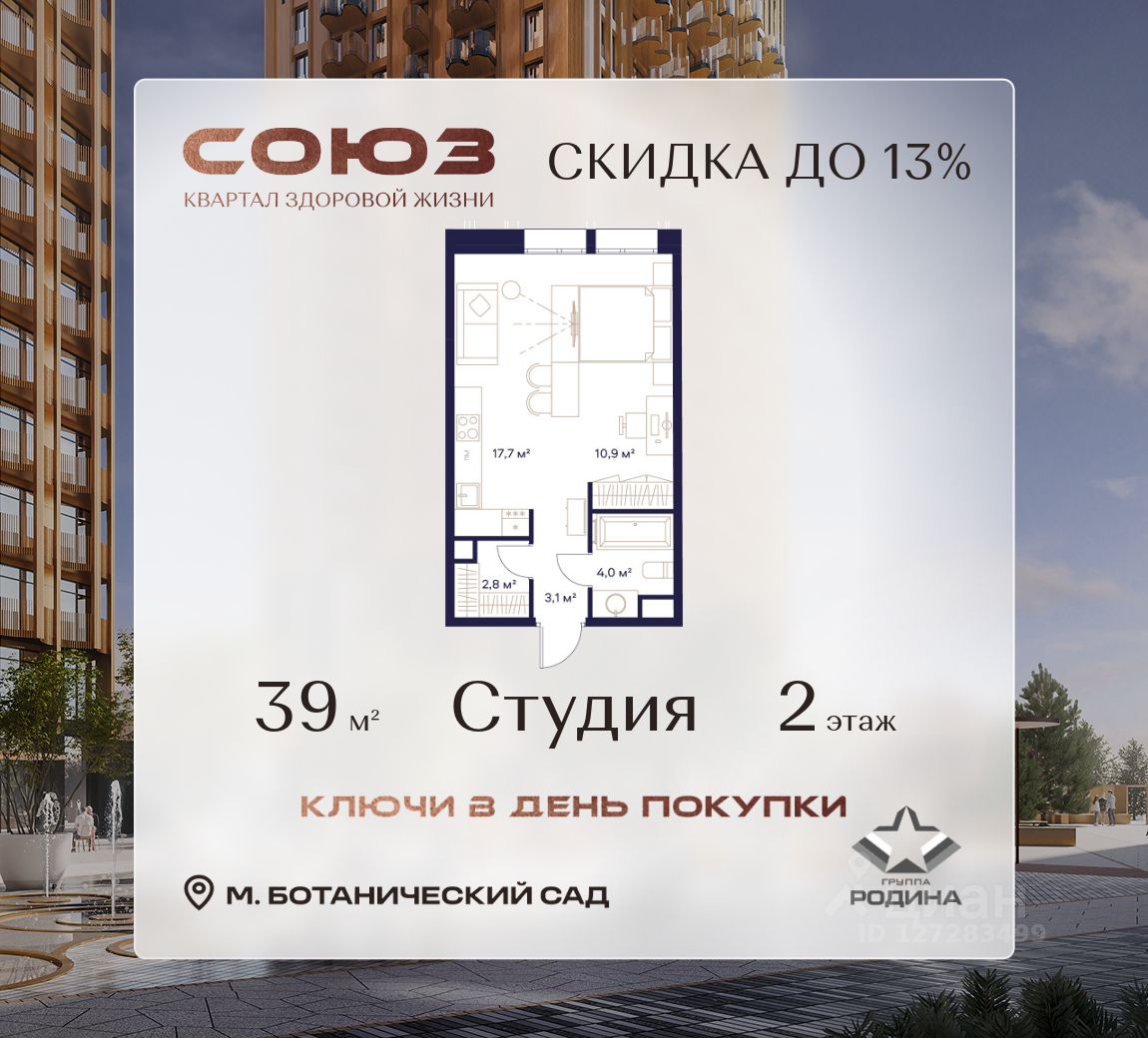 Продаётся квартира-студия площадью 39 м² на 2 этаже в Жилом Комплексе "Союз".