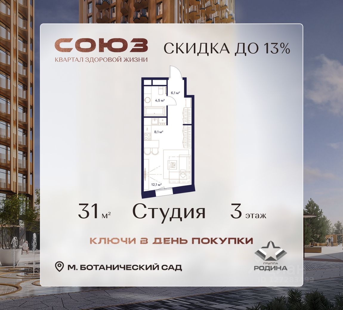 Продаётся квартира-студия площадью 31 м² на 3 этаже в Жилом Комплексе "Союз".