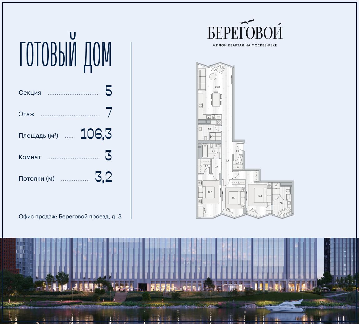 Река. Парк. Сити. Готовый дом в идеальном месте. Продается 3-комнатная квартира на 7 этаже с панорамным остеклением и видом на Береговой пр-д.