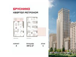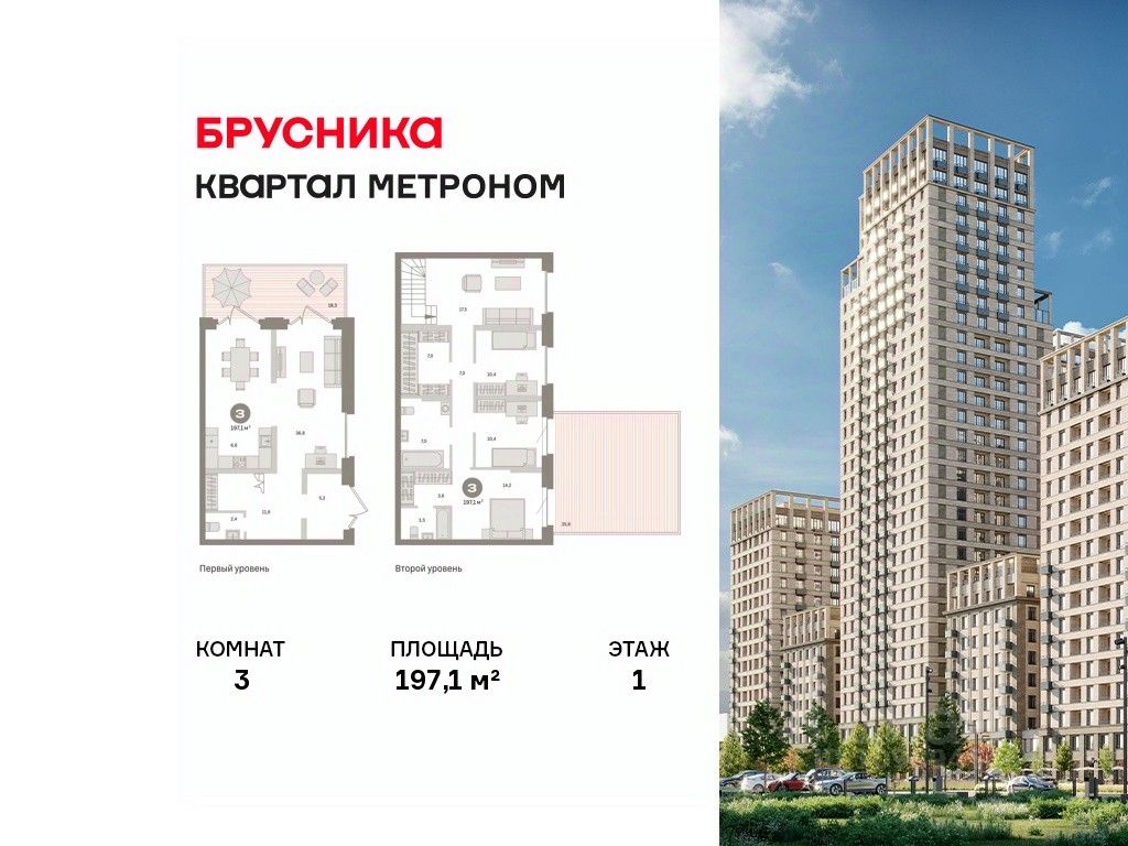 Квартира с кухней-гостиной и тремя спальнями в квартале "Метроном". Особенности планировки: второй санузел, окно в коридоре, гардеробная, окна в пол, без отделки, вид во двор, отдельный вход, панорамное остекление, ипотека 9%, мастер-спальня, терраса на крыше.