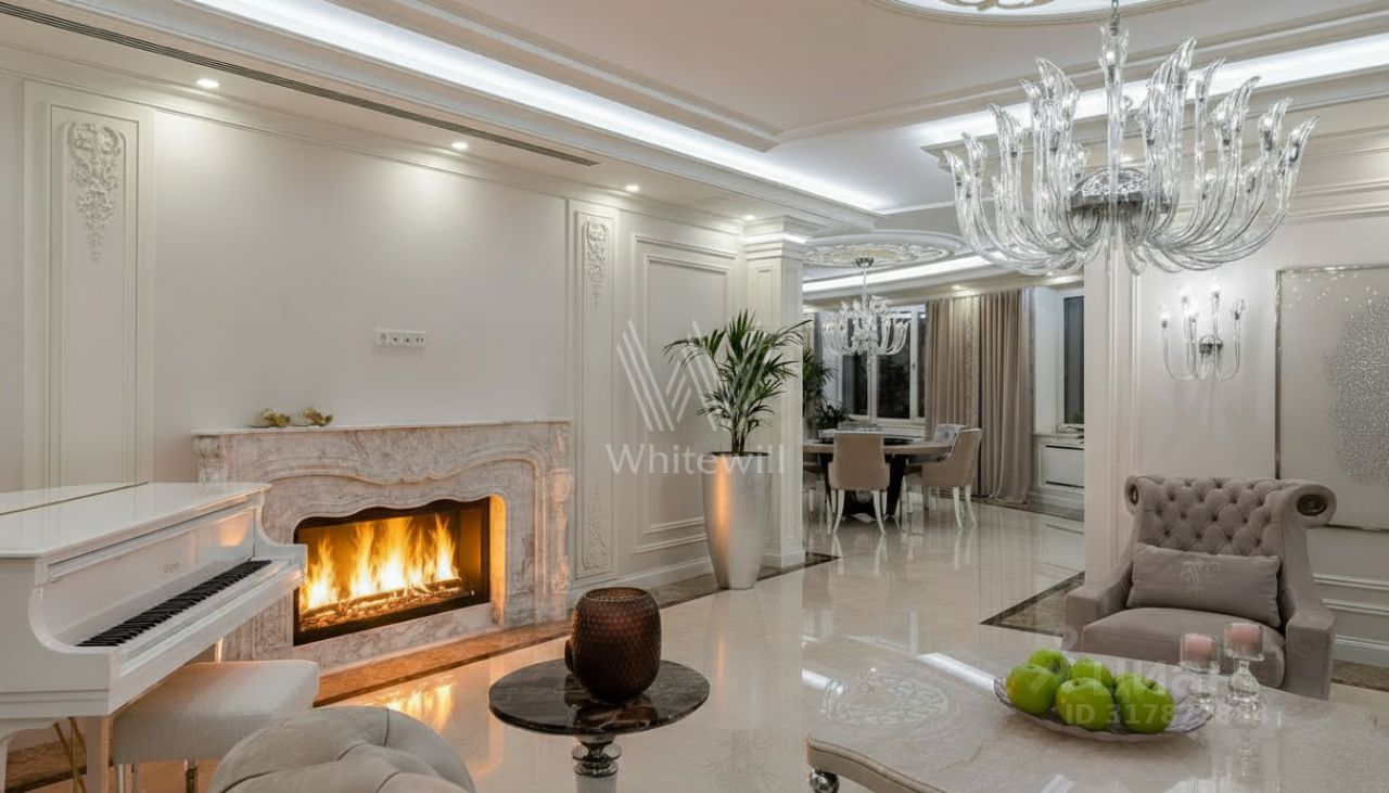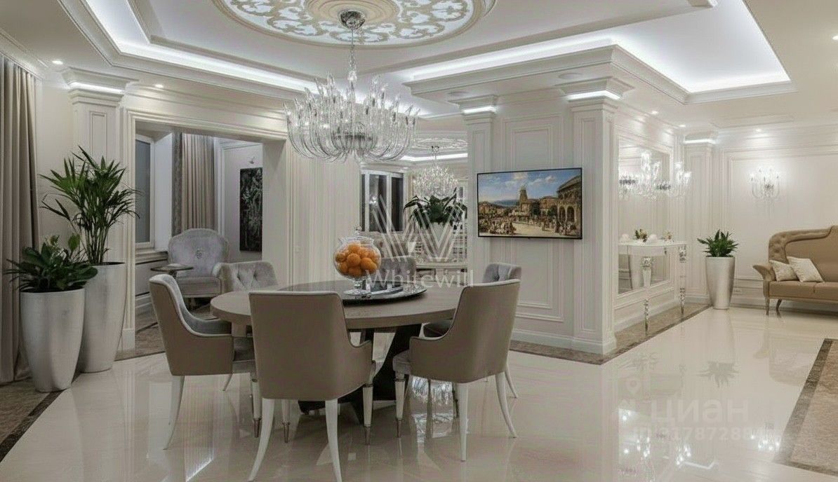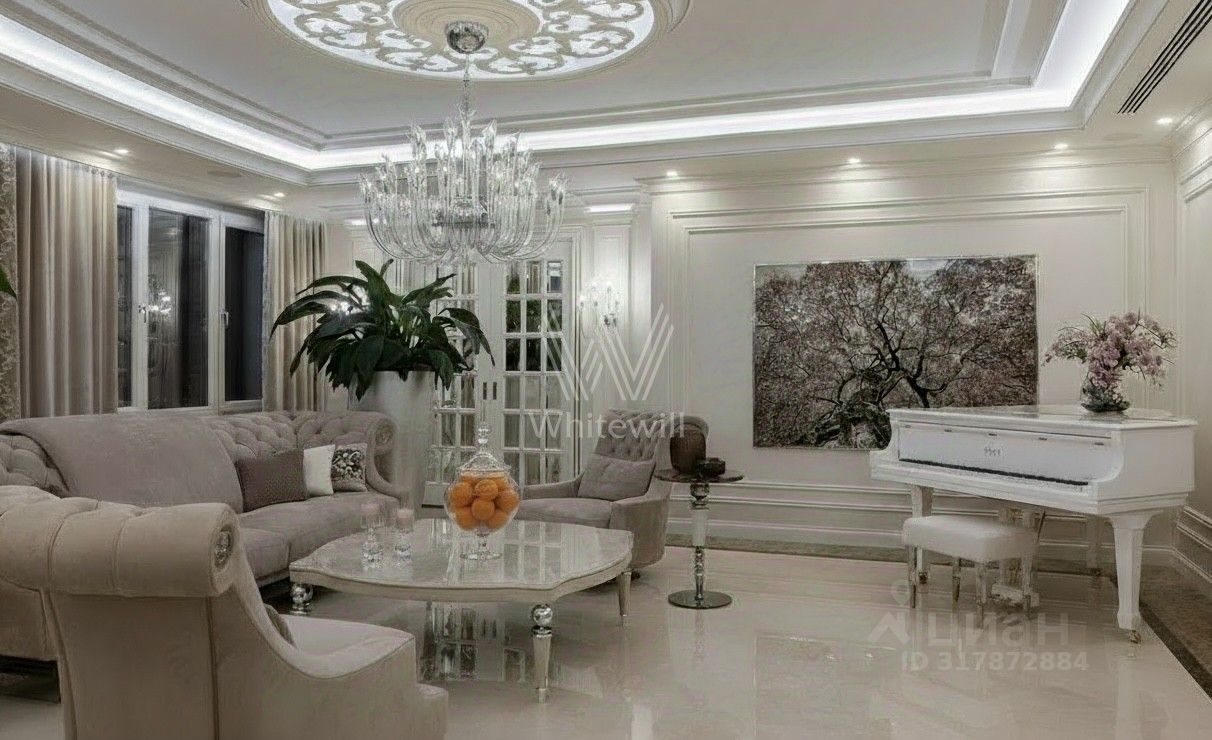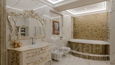 Видовой пентхаус площадью 510 м² в комплексе "Розмарин". Выполнен авторский ремонт по проекту дизайнера Анжелики Прудниковой. В отделке использованы ценные породы дерева и натуральный камень. Полы и подоконники оформлены мрамором, на полу выложена инженерная доска. Ванные комнаты отделаны итальянским керамогранитом и мозаикой.