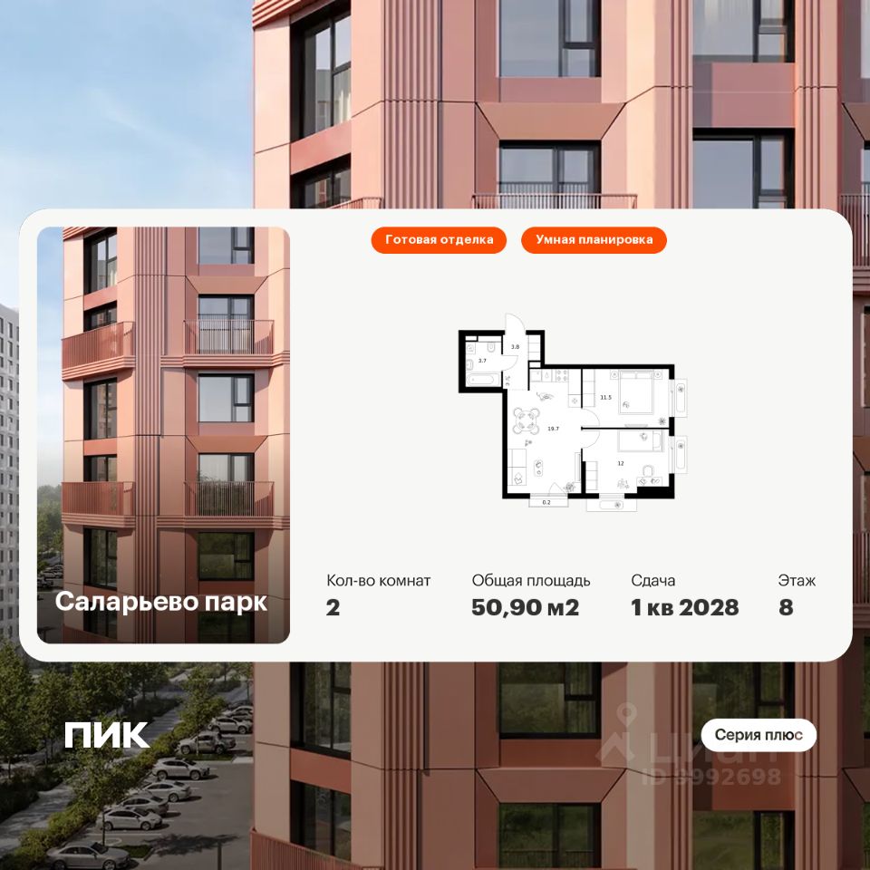 Продаётся 2-комн. квартира площадью 50,9 кв.м на 8 этаже 18 этажного дома (Корпус 74.1, Секция 1) проекта ПИК Саларьево парк. Светлый просторный подъезд на уровне земли, функциональная планировка, большие окна, c отделкой.