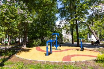 Ухоженный, тихий зеленый двор с детской и спортивной площадкой.