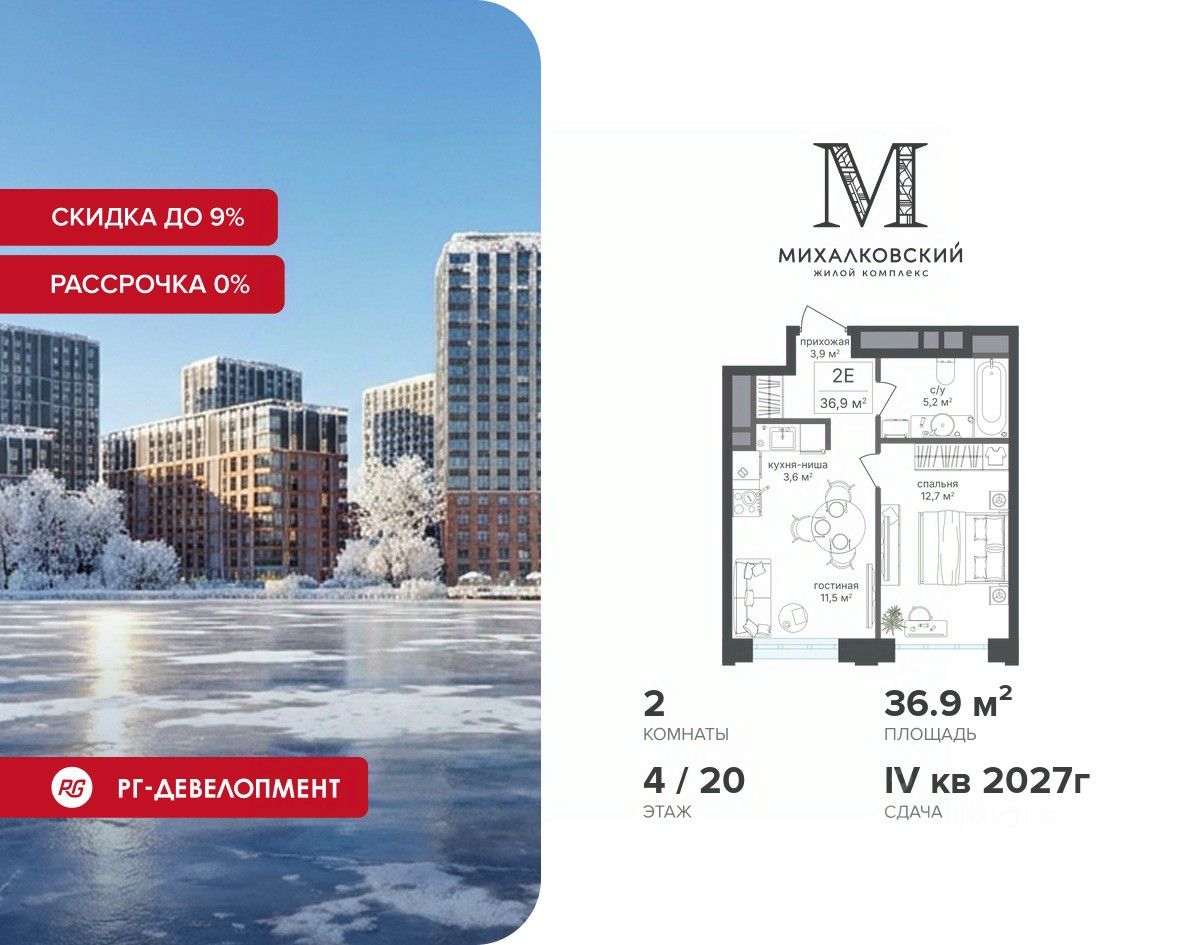 Продаётся 2-к квартира 36,9 кв.м. в ЖК "Михалковский" на 4-м этаже 20 этажного дома.
