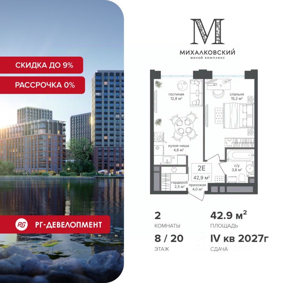 Продаётся 2-к квартира 42,9 кв.м. в ЖК "Михалковский" на 8-м этаже 20 этажного дома.