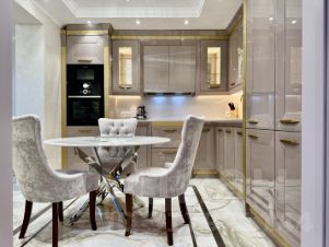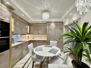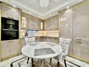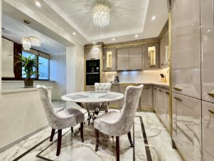Квартира наполнена дорогой техникой и кухонным гарнитуром. Все абсолютно новое без признаков жизни. Много натуральных материалов и камня.