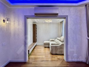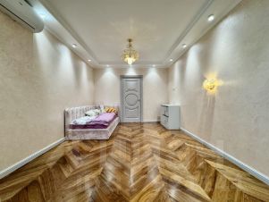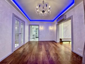 На полах инженерная доска с эффектом волны (американский орех) в некоторых комнатах французская паркетная доска, проводка компании SWG, межкомнатные двери АТЛАС ЛЮКС, декоративная штукатурка на стенах, плитка итальянской марки, розетки с подсветкой WERKEL, шумоизоляция, хрустальное освещение квартиры, ванная комната с ДЖАКУЗИ, множество подсветки квартиры в разных тонах.
