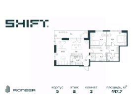 3-к квартира в премиальном комплексе SHIFT на 2-м этаже в 18 этажном здании. Общая площадь 117.7 кв. м.