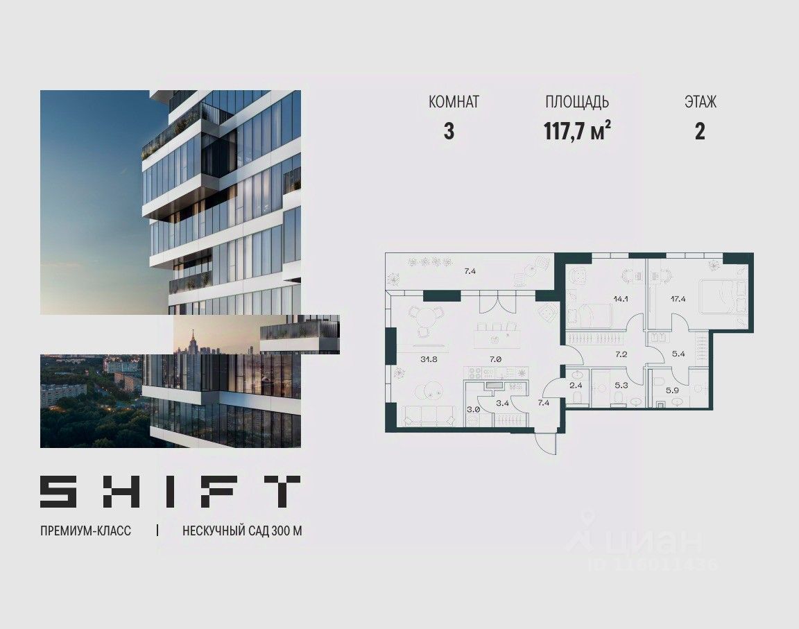 3-к квартира в премиальном комплексе SHIFT на 2-м этаже в 18 этажном здании. Общая площадь 117.7 кв. м. SHIFT - новый премиальный проект от девелопера PIONEER в Донском районе, в 300 м от Нескучного сада. Главная особенность проекта - 5 башен, в которых воплощен принцип модульной архитектуры: каждый этаж смещен относительно предыдущего, что создает эффект парящих в воздухе граней. Архитектура SHIFT создана самым востребованным бюро Москвы - "Цимайло Ляшенко и Партнеры". У жилого квартала удобное расположение: Ленинский проспект ведет прямо к Садовому кольцу и в центр, а быстрый выезд на ТТК станет ключом к любому району Москвы. Многообразие сервисов и коммерческих помещений создает в SHIFT всю необходимую инфраструктуру: кафе и рестораны, street retail, супермаркет и многое другое. Преимущества проекта: - Потолки от 3,65 м - Панорамные окна и террасы - Приватный ландшафтный двор-парк 4 000 м2 - Коммерческая инфраструктура 4 000 м2 - Клубная инфраструктура 350 м2 Девелопер: За 24 года на рынке недвижимости компания PIONEER реализовала более 30 проектов. Сегодня PIONEER - девелопер премиальной недвижимости с 4 проектами класса премиум и deluxe. Звоните, и мы с удовольствием расскажем все подробности о проекте и условиях покупки. Продажа от застройщика. Покупка доступна в ипотеку.