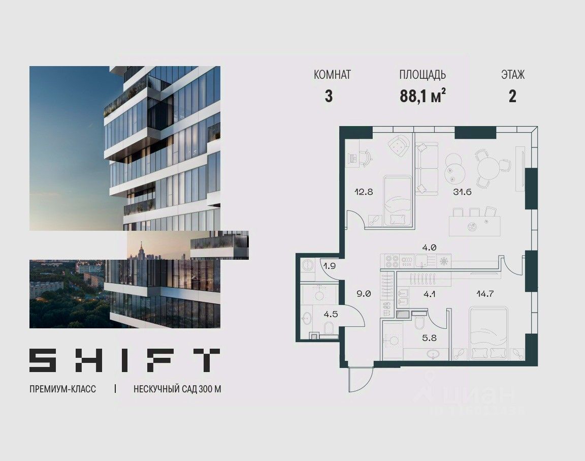 3-к квартира в премиальном комплексе SHIFT на 2-м этаже в 18 этажном здании. Общая площадь 88.1 кв. м.