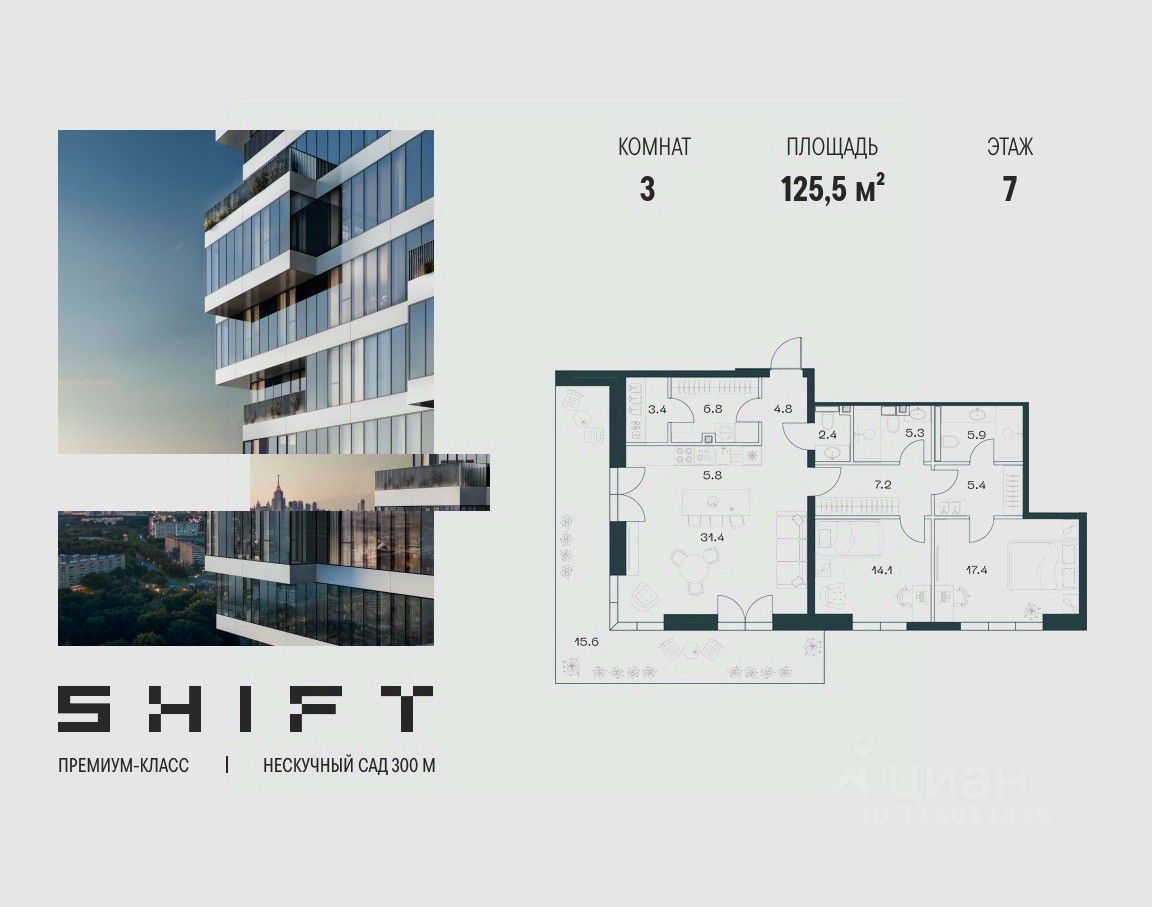 3-к квартира в премиальном комплексе SHIFT на 7-м этаже в 18 этажном здании. Общая площадь 125.5 кв. м.
