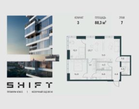3-к квартира в премиальном комплексе SHIFT на 7-м этаже в 18 этажном здании. Общая площадь 88.3 кв. м.