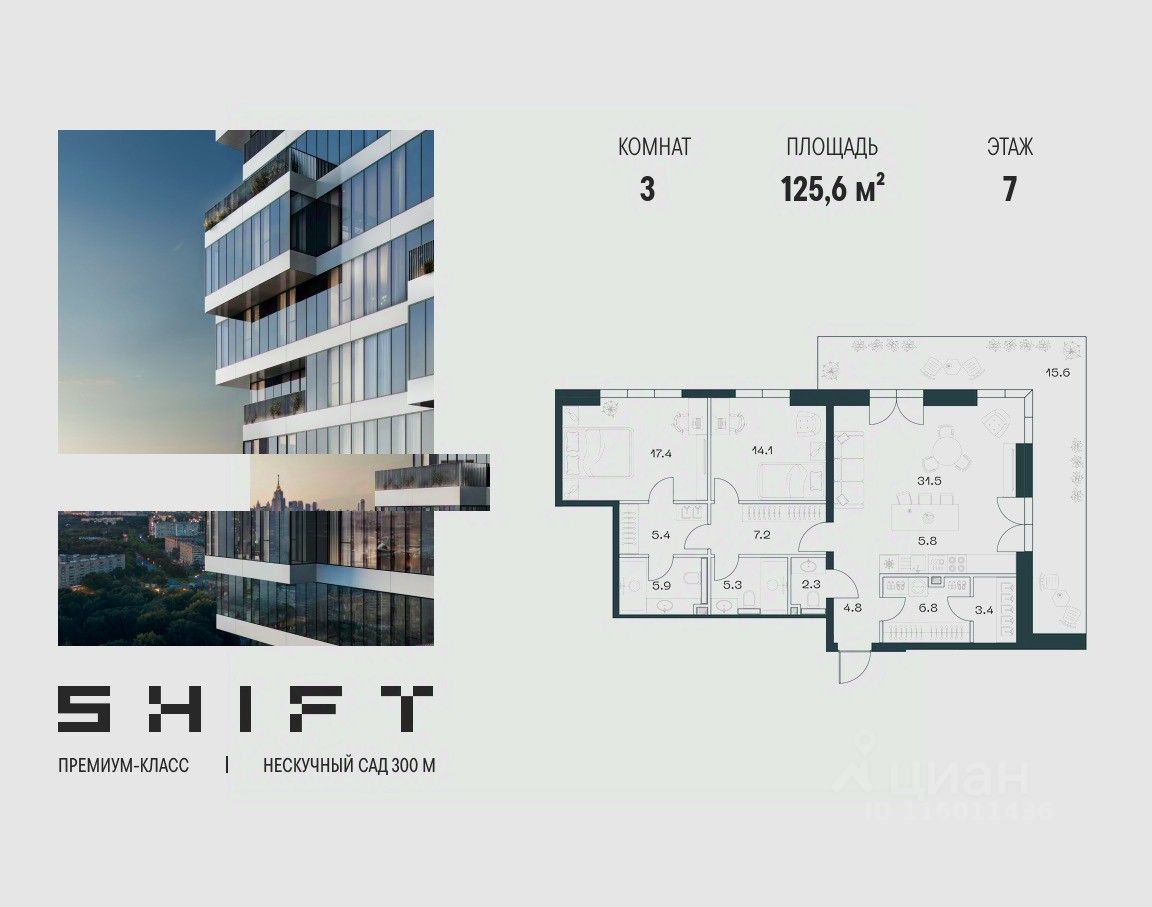 3-к квартира в премиальном комплексе SHIFT на 7-м этаже в 18 этажном здании. Общая площадь 125.6 кв. м.