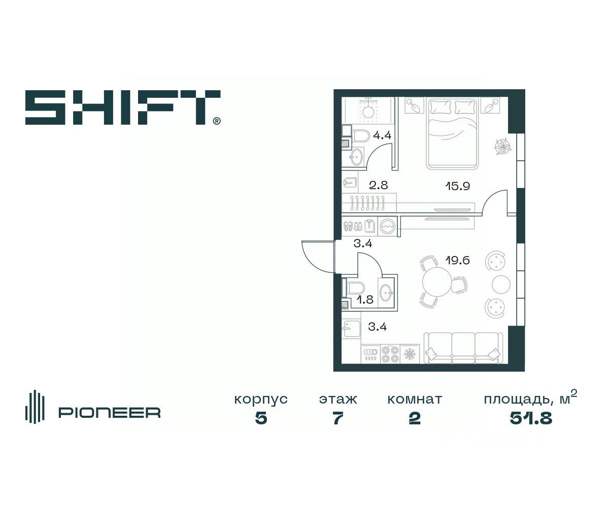 2-к квартира в премиальном комплексе SHIFT на 7-м этаже в 18 этажном здании. Общая площадь 51.8 кв. м.