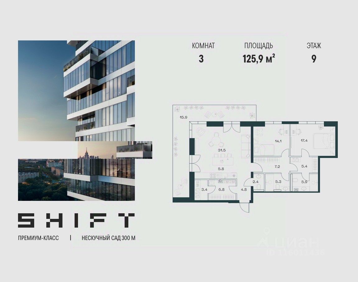 3-к квартира в премиальном комплексе SHIFT на 9-м этаже в 18 этажном здании. Общая площадь 125.9 кв. м.