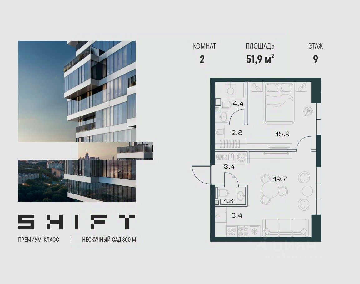 2-к квартира в премиальном комплексе SHIFT на 9-м этаже в 18 этажном здании. Общая площадь 51.9 кв. м.