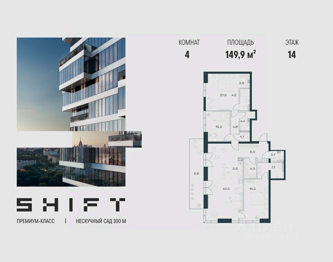 4-к квартира в премиальном комплексе SHIFT на 14-м этаже в 18 этажном здании. Общая площадь 149.9 кв. м.
