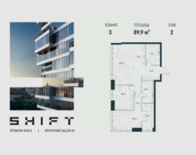 3-к квартира в премиальном комплексе SHIFT на 2-м этаже в 18 этажном здании. Общая площадь 89.9 кв. м.