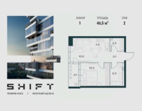 1-к квартира в премиальном комплексе SHIFT на 2-м этаже в 18 этажном здании. Общая площадь 46.5 кв. м.