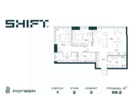 3-к квартира в премиальном комплексе SHIFT на 2-м этаже в 18 этажном здании. Общая площадь 90.2 кв. м.