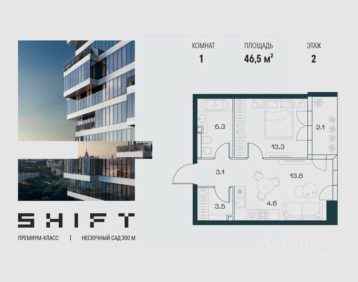1-к квартира в премиальном комплексе SHIFT на 2-м этаже в 18 этажном здании. Общая площадь 46.5 кв. м.
