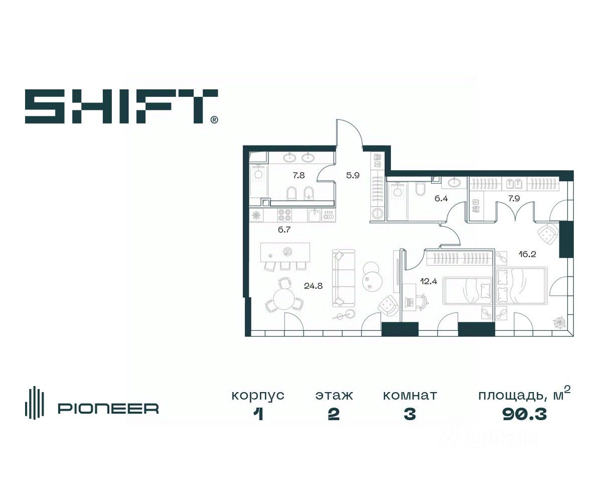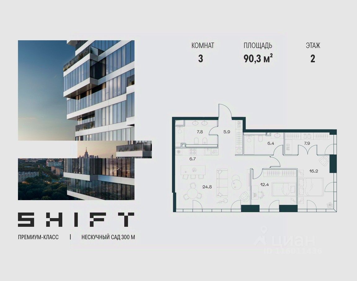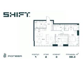 3-к квартира в премиальном комплексе SHIFT на 2-м этаже в 18 этажном здании. Общая площадь 90.3 кв. м.