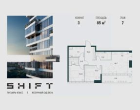 3-к квартира в премиальном комплексе SHIFT на 7-м этаже в 18 этажном здании. Общая площадь 85 кв. м.
