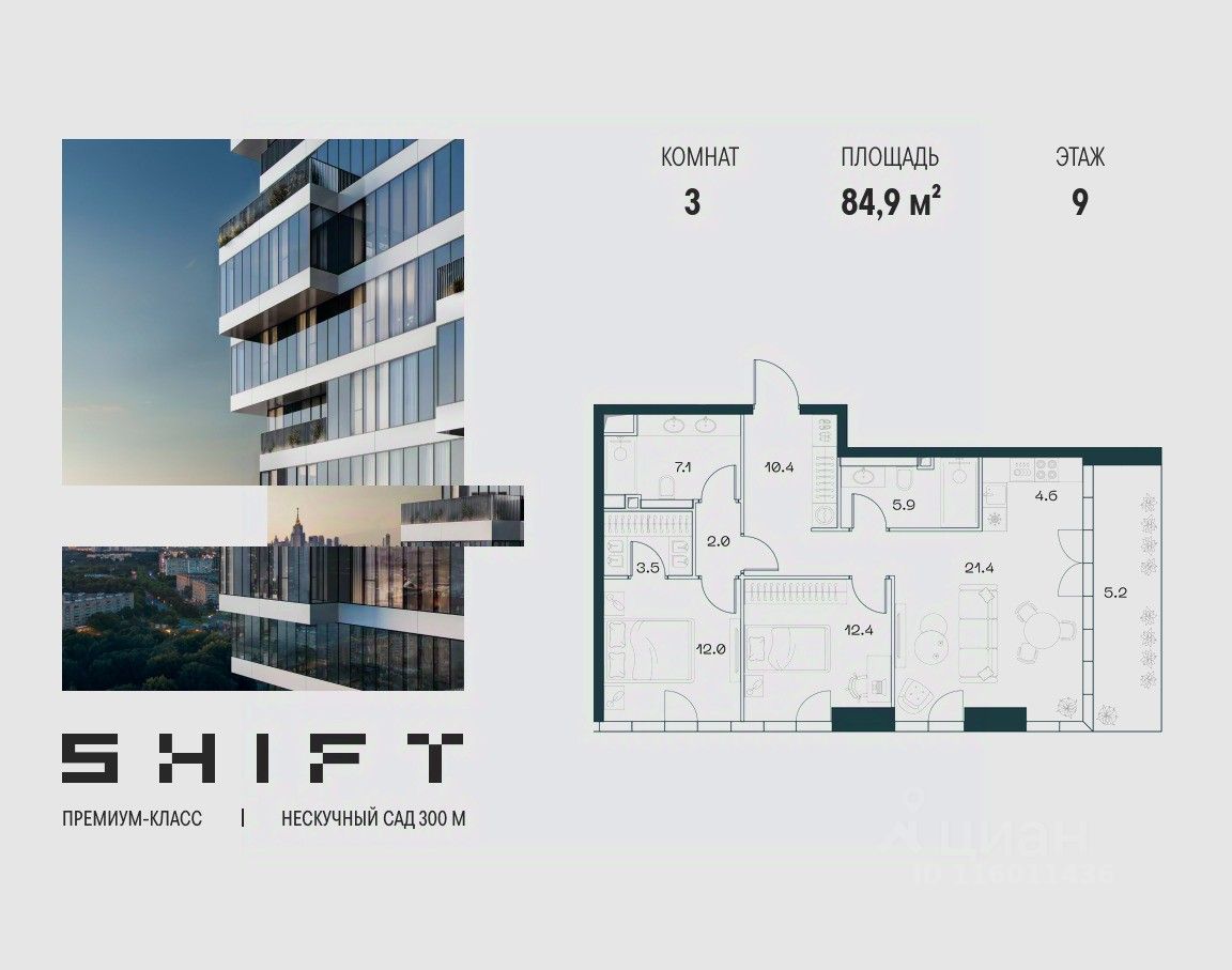 3-к квартира в премиальном комплексе SHIFT на 9-м этаже в 18 этажном здании. Общая площадь 84.9 кв. м.