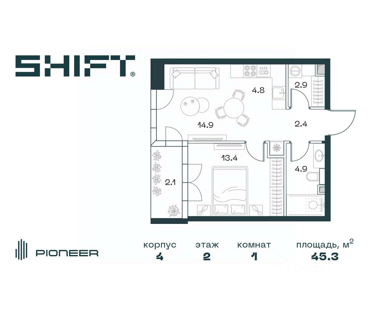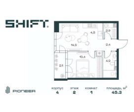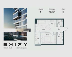 1-к квартира в премиальном комплексе SHIFT на 2-м этаже в 18 этажном здании. Общая площадь 45.3 кв. м.