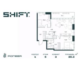 3-к квартира в премиальном комплексе SHIFT на 5-м этаже в 18 этажном здании. Общая площадь 85.3 кв. м.