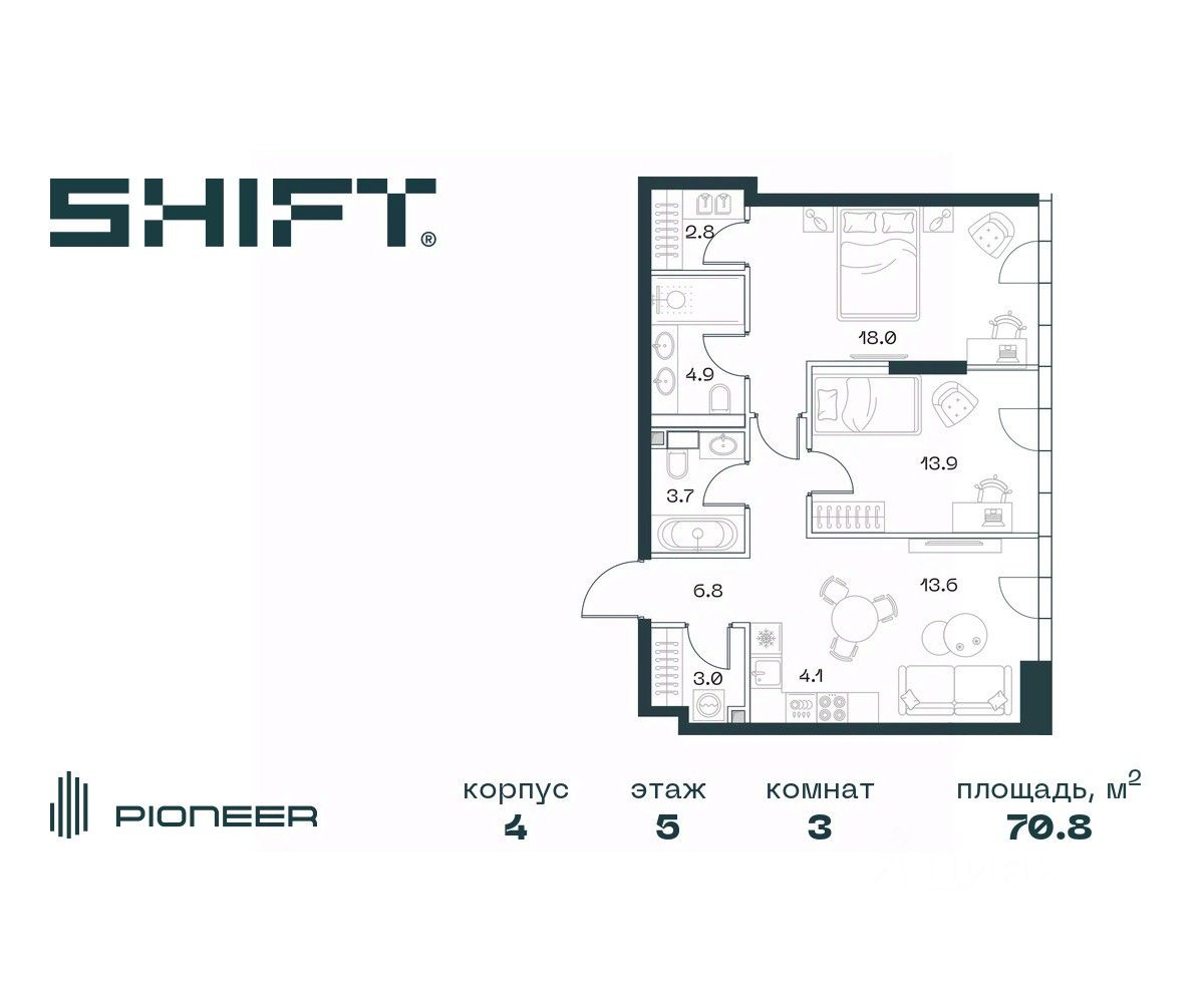 3-к квартира в премиальном комплексе SHIFT на 5-м этаже в 18 этажном здании. Общая площадь 70.8 кв. м.