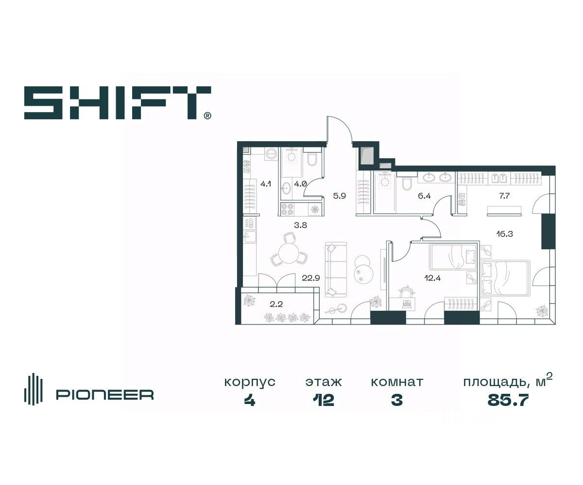 3-к квартира в премиальном комплексе SHIFT на 12-м этаже в 18 этажном здании. Общая площадь 85.7 кв. м.