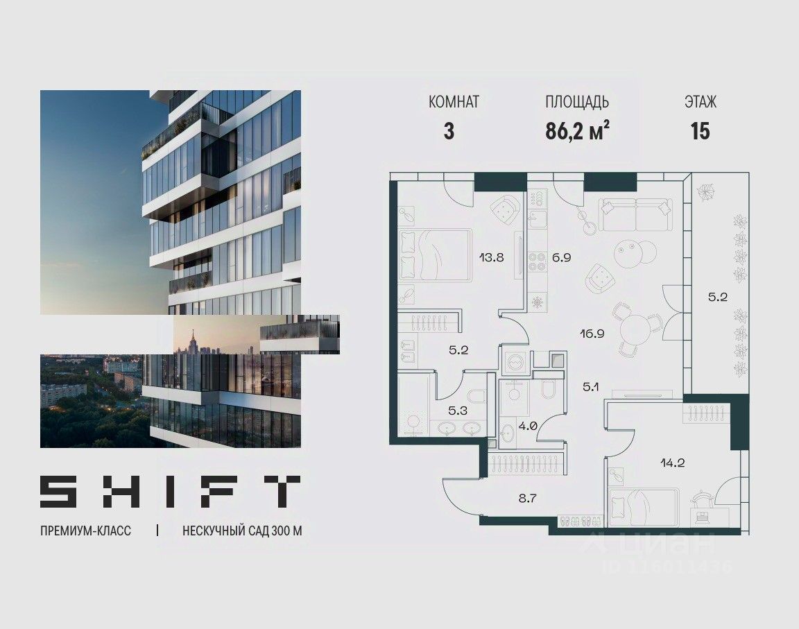 3-к квартира в премиальном комплексе SHIFT на 15-м этаже в 18 этажном здании. Общая площадь 86.2 кв. м.