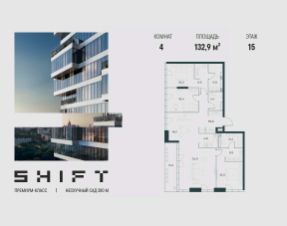 4-к квартира в премиальном комплексе SHIFT на 15-м этаже в 18 этажном здании. Общая площадь 132.9 кв. м.