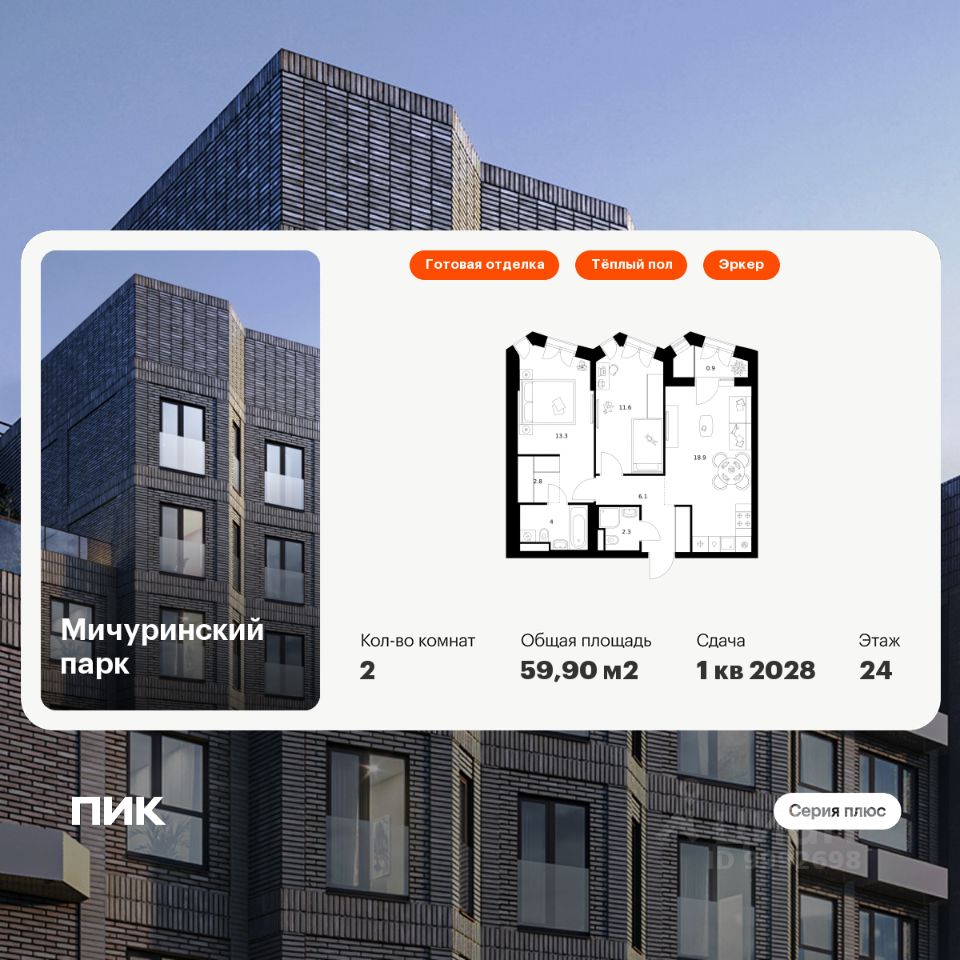 Продаётся 2-комн. квартира площадью 59,9 кв.м на 24 этаже 24 этажного дома (Корпус 4.2, Секция 1) проекта ПИК Мичуринский парк. Светлый просторный подъезд на уровне земли, функциональная планировка, большие окна, c отделкой.