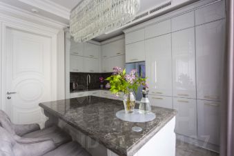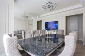 Мебель в кухне и в гостинной - estetica vision (стол, стулья, диваны), техника: Smeg, холодильник - Liebherr, стиральная и сушильная машины Miele. Камень стола, острова, кухонного гарнитура - кварцит, в гостинной - лабладор. В мастер-спальне - мебель Италия. Спальня (мальчика) - кровать mebel and zieght с подъемным механизмом. Спальня (девочка) - Angelic Room (Полный комплект мебели). Детская спальня - диван с раскладным механизмом. В прихожей - консоль Estetica Vision (мрамор)