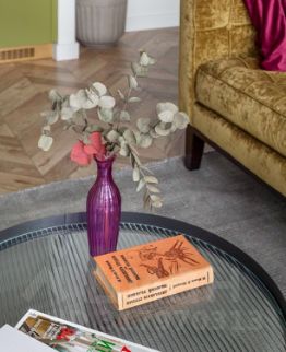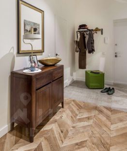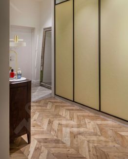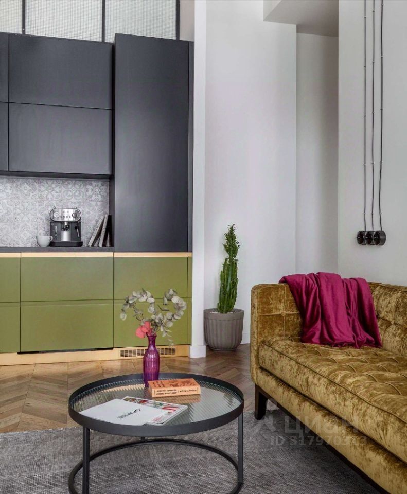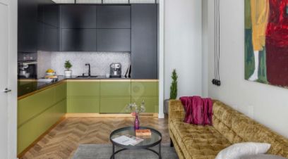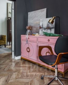 Современный дизайнерский ремонт в актуальном стиле — кухня в модной комбинации оттенков, паркет ёлочка от Kaindl, бархатный диван, розовый комод, буфет, обеденный стол от Kare, авторский декор. Высокие потолки, большие окна, качественные отделочные материалы.