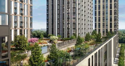 На крыше стилобата (уровень 6 этажа) расположена благоустроенная зеленая зона отдыха только для взрослых и маленьких резидентов ЖК: прогулочные дорожки, лежаки, скамейки, столики, зоны для игр и спорта. Первые 6 этажей жилого комплекса коммерческие помещения: большой торговый центр Дискавери, магазины, аптеки, фудкорт, кофейни, банки, фитнес-центр, М.Видео, World Class с бассейном, МФЦ Мои документы.