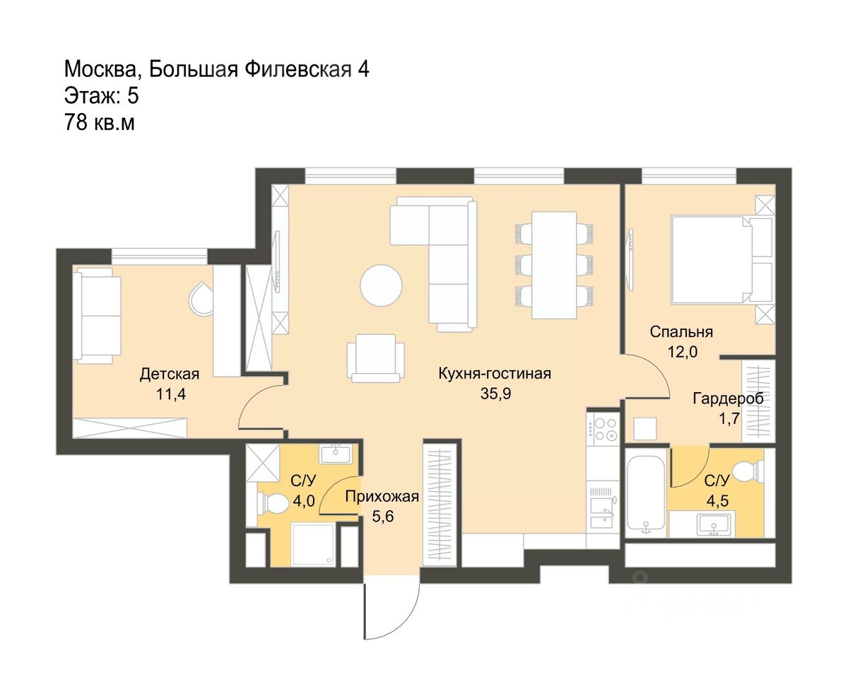 - Мастер-спальня 12 м² с гардеробом 1,7 м² и санузлом 4,5 м²